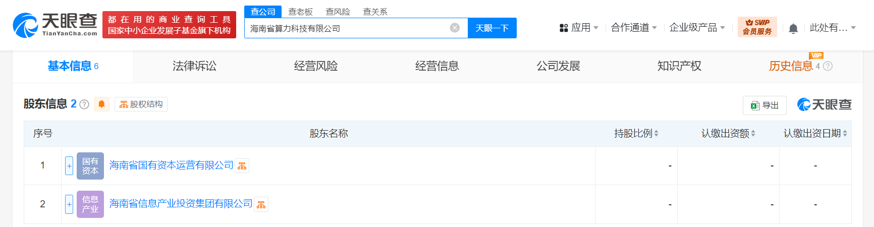 每经AI快讯,天眼查App显示,近日,海南省算力科技有限公司成立,法定代表人为唐琼标,注册资本5亿元人民币,经营范围含物联网应用服务、物联网技术研发、云计算装备技术服务、大数据服务、人工智能行业应用系统集成服务、人工智能公共数据平台、工业互联网数据服务、信息系统集成服务、网络与信息安全软件开发等。股东信息显示,该公司由海南省国有资本运营有限公司、海南省信息产业投资集团有限公司共同持股。
