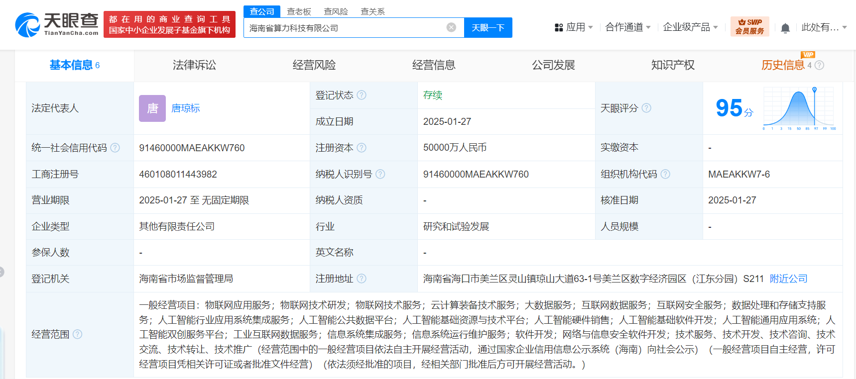 海南省算力科技公司登记成立 注册资本5亿元